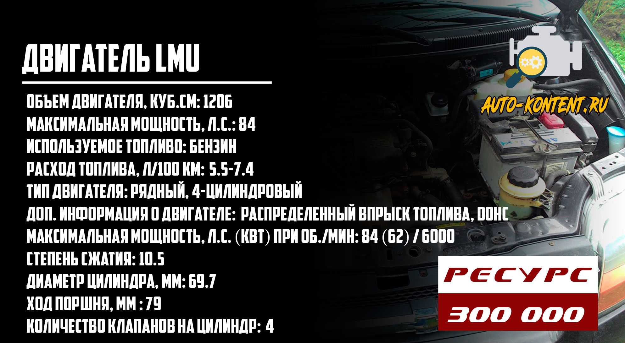 До 2015 года на заводах General Motors собирали 1.2-литровый бензиновый мотор LMU. Его ставили не только на Авео, но еще и на Шевроле Спарк. Двигатель получил несколько модификаций, которые между собой особо ничем не отличаются. Данный мотор оснащен системой распределительного впрыска топлива, развивает 84 лошадиные силы и 114 Нм момента. Чугунный 4-цилиндровый рядный блок цилиндров и 16-клапанная головка блока. Вместо ремня ГРМ в нем задействована цепь. Диаметр «котлов» – 69.7 мм, а ход поршня 79 мм. Двигатель оснащен системой изменения геометрии впуска VGIS.