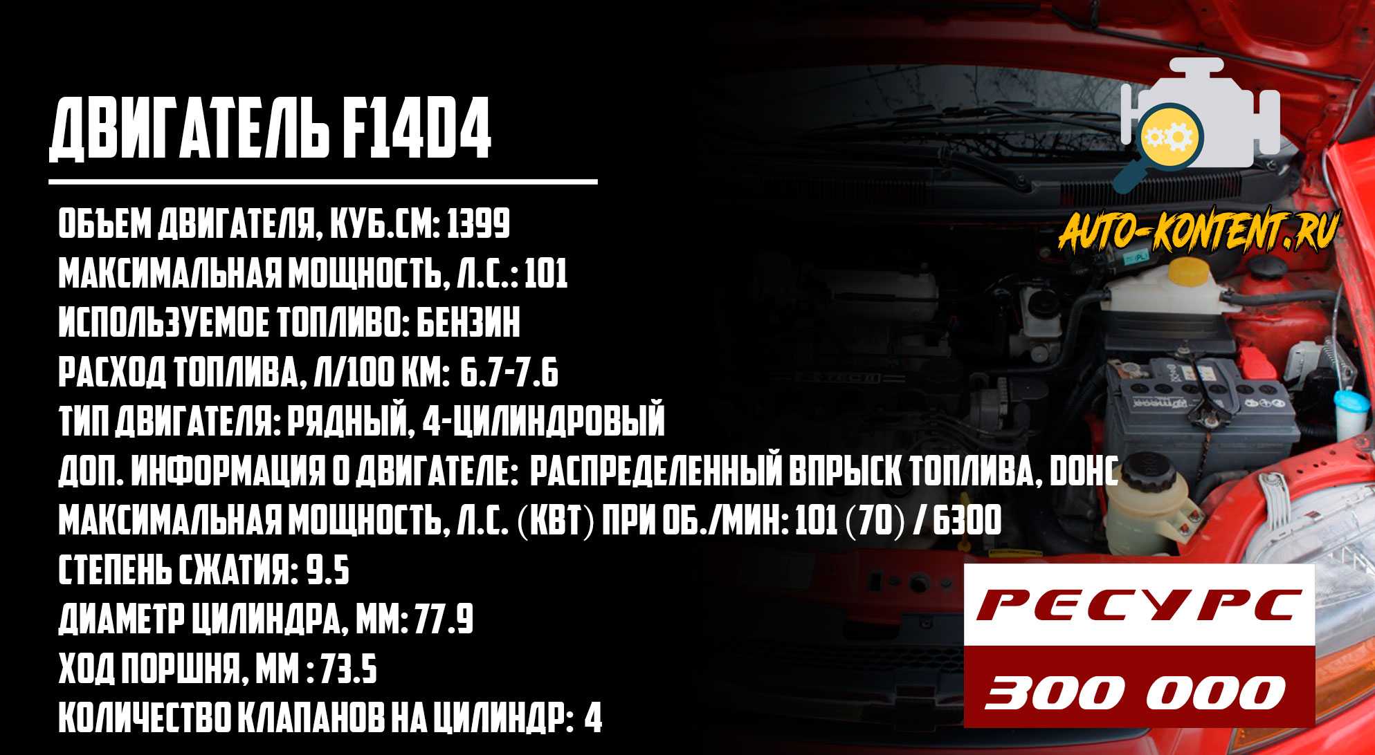 Двигатель Шевроле 1.4 F14D3 предназначен для автомобилей Шевроле Лачетти (Chevrolet Lacetti), Шевроле Авео (Chevrolet Aveo). Двигатель выпускался с 2000 по 2008 год. Особенности. Шевроле 1.4 F14D3 является модернизированной версией мотора Опель X14XE. Многие детали этих моторов взаимозаменяемы. На двигателе установлен клапан EGR (система рециркуляции отработанных газов), которы позволяет снизить содержание вредных веществ в выхлопных газах. Привод ГРМ на Шевроле 1.4 применен ременной. При обрыве ремня ГРМ клапана гнет. Необходимости в регулировке клапанов нет, здесь установлены гидрокомпансаторы. Неисправности известные по этому моторы могут быть следующие: подвисание клапанов из-за нагара между штоком клапана и втулкой клапана (двигатель троит, глохнет, теряет мощность); могут забиться топливные форсунки; термостат выходит из стоя к 50-60 тыс. км; течь клапанной крышки чревато попаданием масла в свечные колодцы, в результате чего возникают проблемы с зажиганием. В 2008 году двигатель подвергся некоторым изменениям и получил название F14D4. У мотора F14D3 есть старший брат объемом 1.6 литра и мощностью 106 л.с. При нормальной бережной эксплуатации и своевременному обслуживанию с использованием качественных масел и топлива двигатель проходит 200-250 тыс. км без каких-либо проблем.