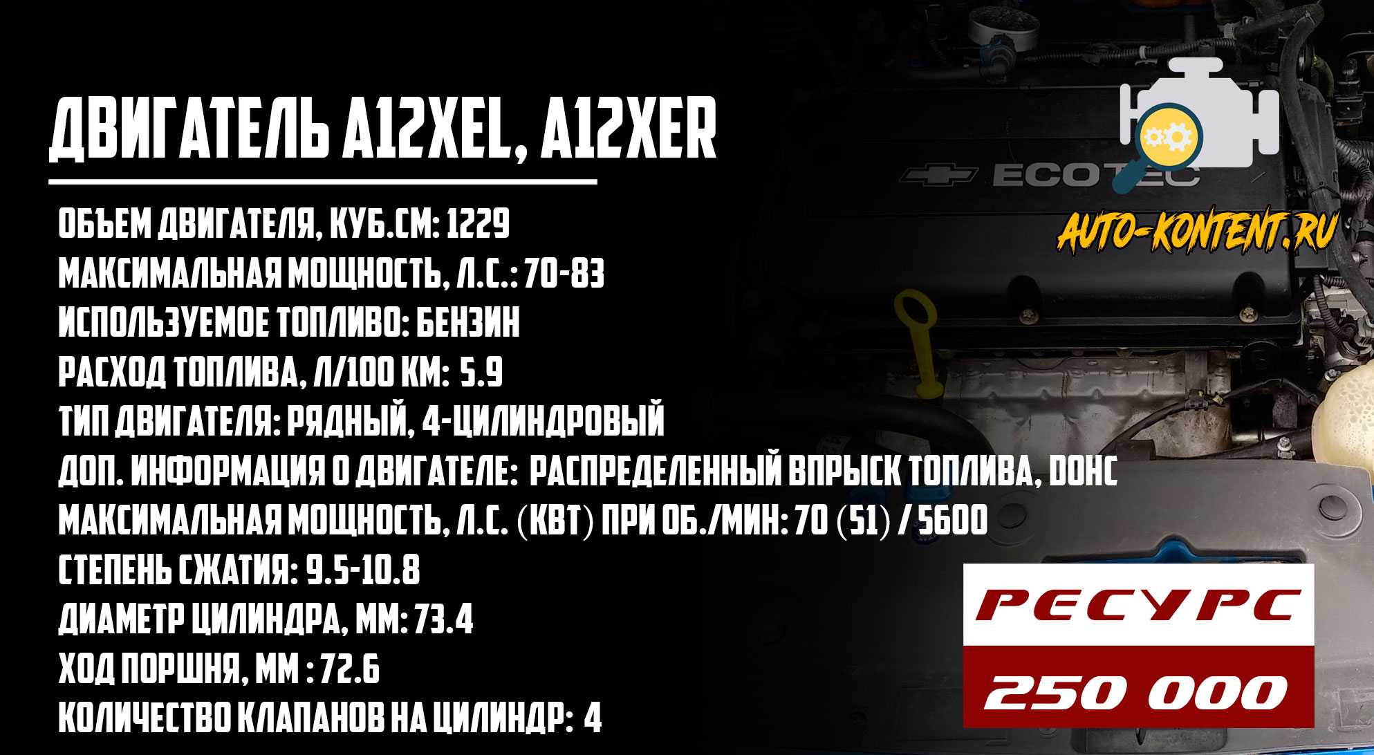 Это бензиновый атмосферный мотор на 1.2 литра и мощностью 83 лошадиные силы. Этот же двигатель ставили под капот Опель Корса до 2014 года. Автомобиль с таким двигателем официально продавили в Европе – второе поколение авто. Представляет собой 4-рядный силовой агрегат с алюминиевой 16-клапанной ГБЦ. В нем два распределительных вала DOHC, диаметр цилиндров 73.4 мм, а ход поршня 72.6 мм. Конструктивно между двигателями A12XEL и A12XER нет особой разницы. Разница лишь в том, что первый «задушен» из-за экологических норм, поэтому его мощность составляет всего 70 лошадиных сил, а крутящий момент в пике составляет 115 Нм.