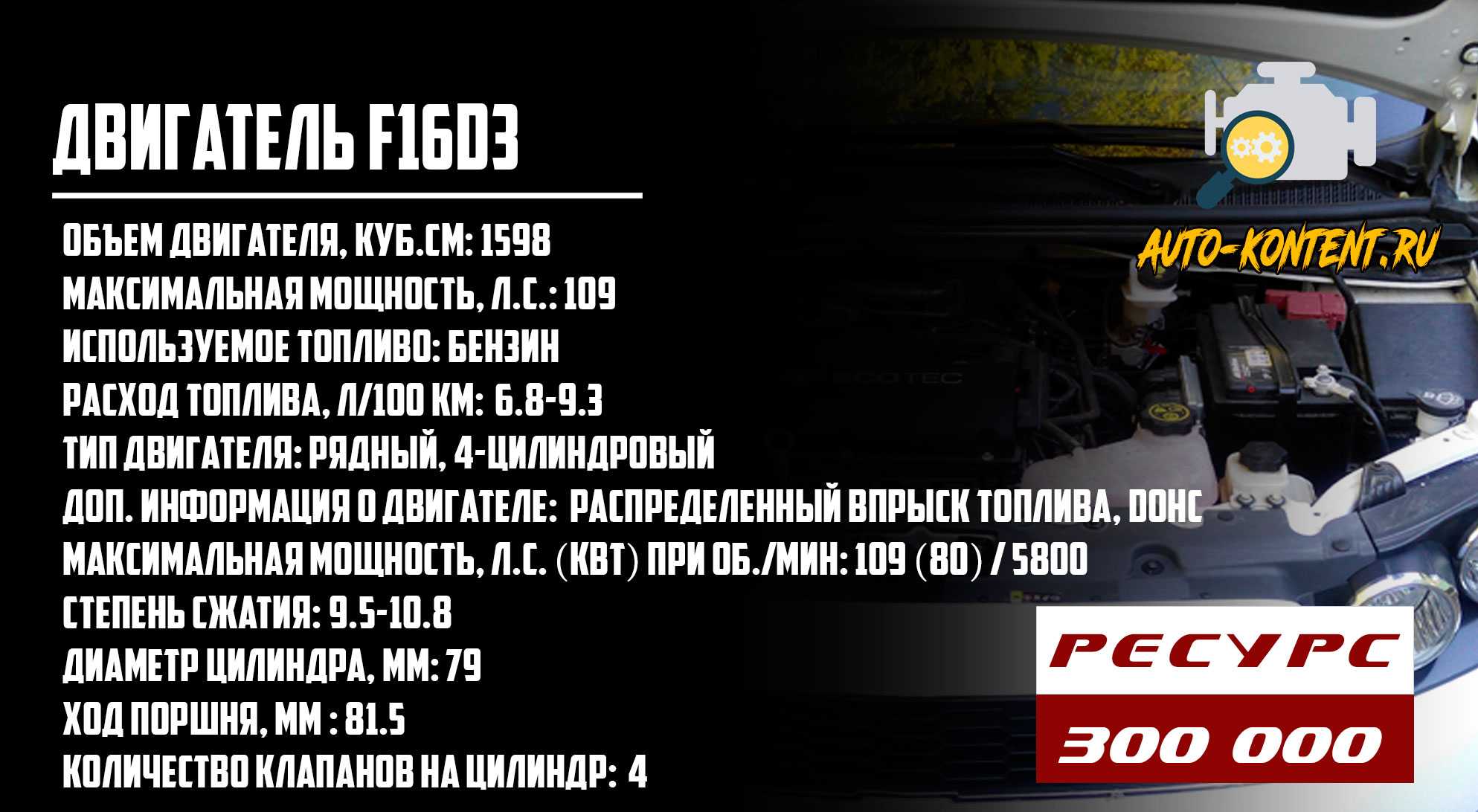 Двигатель Шевроле 1.6 F16D3 устанавливался на автомобили Шевроле Круз (Chevrolet Cruze), Шевроле Лачетти (Chevrolet Lacetti), Шевроле Авео (Chevrolet Aveo), Шевроле Ланос (Chevrolet Lanos), а также на Дэу Нексия (Daewoo Nexia). Двигатель появился в 2004 году и производится по настоящее время. Особенности. Шевроле 1.6 F16D3 построен на базе двигателя 1.4 F14D3, который в свою очередь является копией мотора Опель X14XE. Многие детали этих двигателей можно устанавливать на оба мотора. Двигатель 1.6 ничем по конструкции не отличается от 1.4: привод ГРМ ременной, двухвальная голова, установлены гидрокомпенсаторы, система рециркуляции отработанных газов EGR. Неисправности те же что и у двигателя F14D3: подвисающие клапана, вредные топливные форсунки, ненадежный термостат, течи масла из-под крышки клапанов. Многие автовладельцы заглушают клапан ЕГР, так как из-за некачественного бензина эта система выходит из строя и двигатель отказывается работать как надо. В 2008 году двигатель усовершенствовали, его название — F16D4. Для тех, кому нужен мотор помощнее есть двигатель 1.8 F18D3 121 л.с. Ресурс двигателя Шевроле 1.6 F16D3 составляет порядка 250 тыс. км.