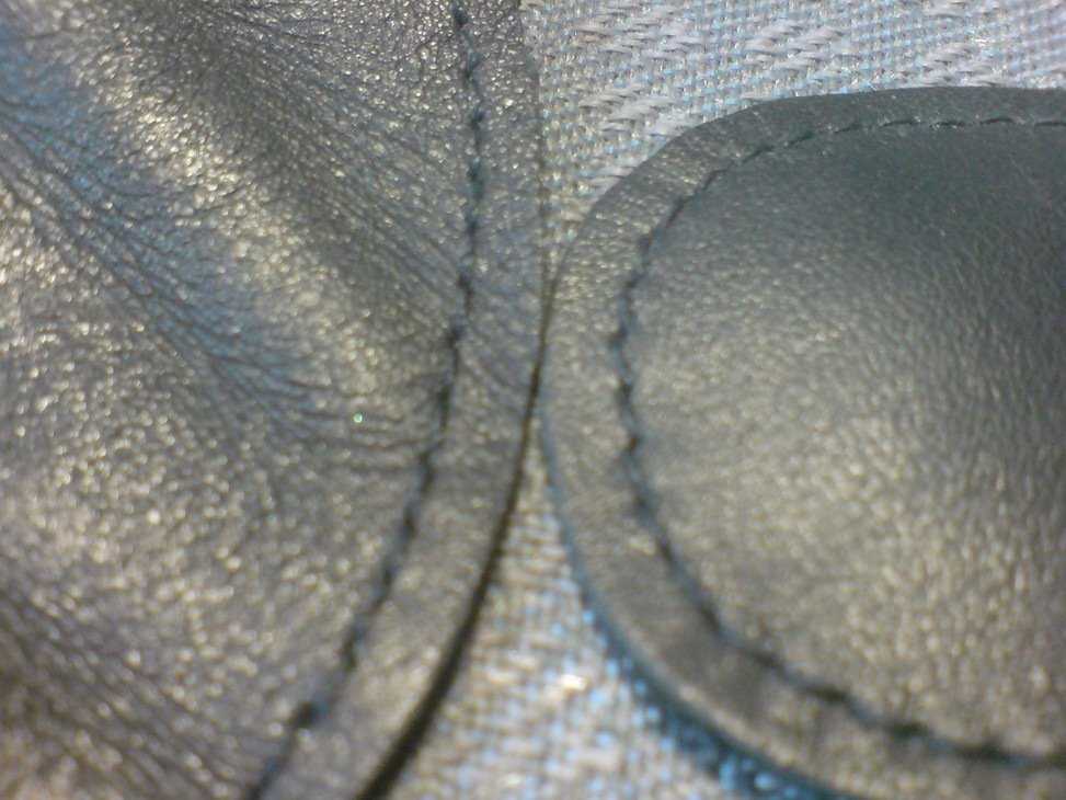 Используя старый кожзам как трафарет нарезал 3 куска кожи (в моем случае 2 куска с ресунком под “сетчатую” кожу и один (задний) кусок я решил сделать из гладкой). Т.к. швейной машинки нет, пришлось шить в ручную. Еще то занятие блин. Использовал толстый шуруп с крестовой головкой вкрученный в толстый пластиковый дюбель, чтоб давить на иглу. Маленькие плоскогубцы чтоб тащить иглу с другой стороны. Два шва делать не стал, уж больно грубая кожа, сделать второй шов как на старом чехле я не смог. Каждый стежок шва проходил 2 раза, на концах швов делал 4-х кратный стежок для прочности. После того как сшил, намазал с внутренней стороны детским маслом “джонсон&джонсон” чтоб можно было тянуть кожу при натягивании на рамку. Засунул пластиковый хомут в специально сшитый паз, установил ручку и натянул хомут со всей дури (плоскогубцами), иначе не стянуть. Дальше просунул в чехол (шла с нехилым нятягом) внутреннюю пластиковую рамку, прорезал дырки под крючки-фиксаторы. Скрепки ставить не стал и так все очень плотно встало. Довольно много времени потратил на установку внутренней рамки во внешнюю. Ну в общем получилось довольно не плохо. Очень похож на заводской, особенно хорошо смотрится решение с разным рисунком на коже. Т.к. кожа значительно толще и грубее кожзама, все изгибы на складках не острые… пологие. Очень благородно смотрится. В общем я доволен. Кстати кожа темнее кожзама (он походу сероватый). Черный смотрится как там и был
