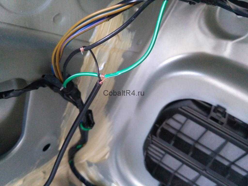 Возьмемся снова за проводку фонаря. Распутываем её. Наша задача найти зеленый и черный провода. Зеленый, соответственно, плюс на фонарь заднего хода, черный — земля. Камера будет запитываться при зажигании фонаря заднего хода и экран автоматически включаться при появлении видео-сигнала: