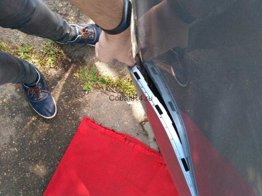 Для этого оттягиваем потихоньку бампер на себя и чуть вверх с помощью одной руки, а другой плоской отверткой аккуратно нажинаем на фиксаторы и отщелкиваем боковую часть бампера. Защелок там пять штук.