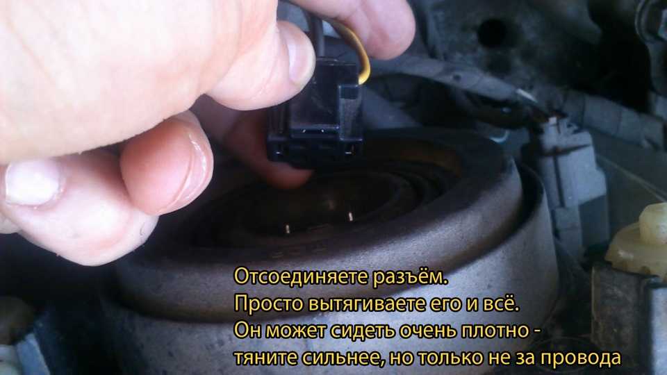 2)Пальцами руки нащупайте и, преодолевая сопротивление, достаньте пластмассовую вилку разъема. Не дергайте ее за провода! К нашей радости разъем не имеет фиксатора. 3)Далее снимайте резиновое кольцо-гофру, защищающую доступ к блок-фаре. Для того сначала потяните за выступающий «хвостик». Затем пальцами передвигайтесь по гофре и оттягивайте ее в сторону АКБ. Фото гофры с обеих сторон приведено ниже.