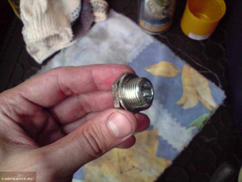 - Также требуется насухо протереть пробку сливного масленого клапана, так как на ней могут остаться частицы отработанного масла вместе с грязью. Есть модели автомобилей, в которых на пробку клапана масленого слива наносится герметик. Он служит дополнительной страховкой от протечек смазывающего материала. Поэтому при смене расходных материалов герметик на пробку клапана слива масла требуется нанести заново.