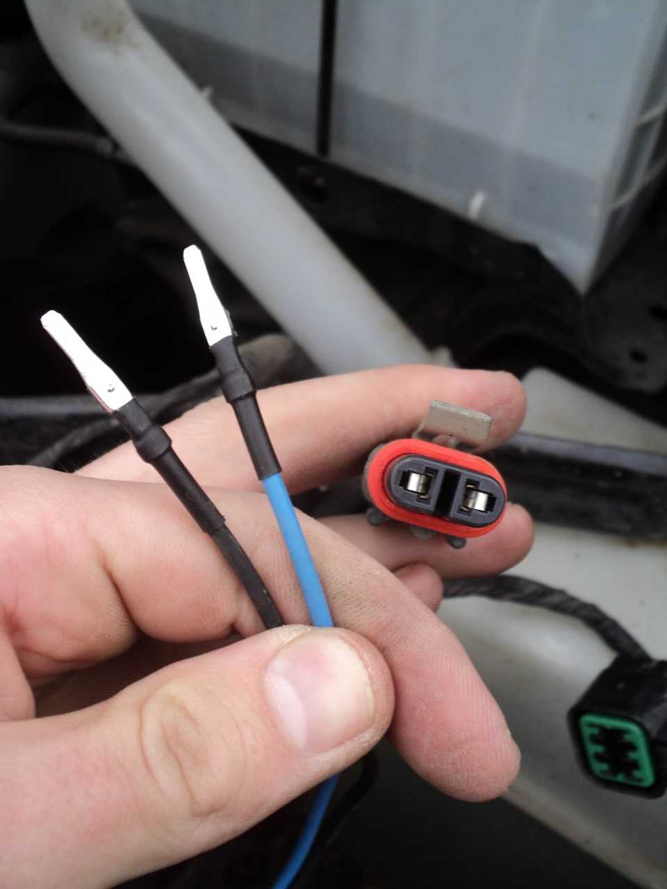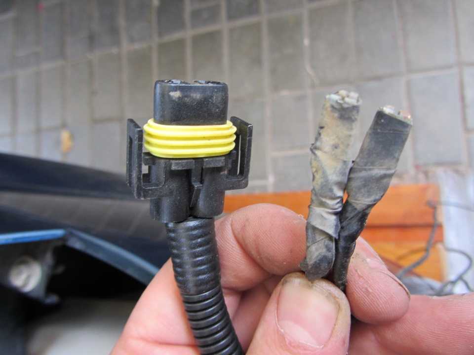 С ранее приобретённого разъёма водительской двери Лачетти были извлечены два толстеньких провода. Они были припаяны к новым проводам ПТФ, а контакты вставлены в соответствующие гнезда: