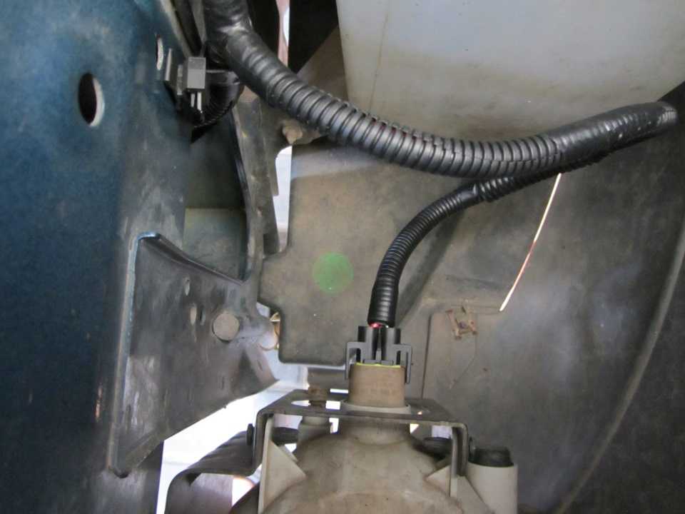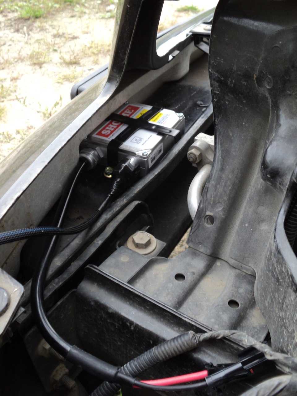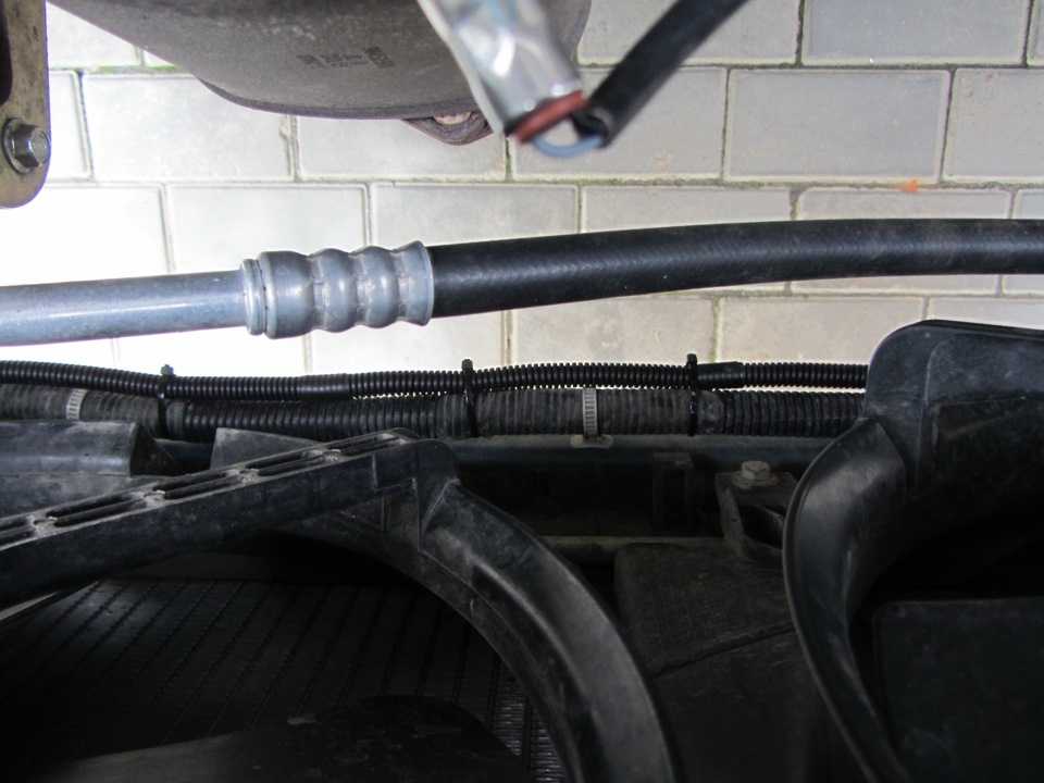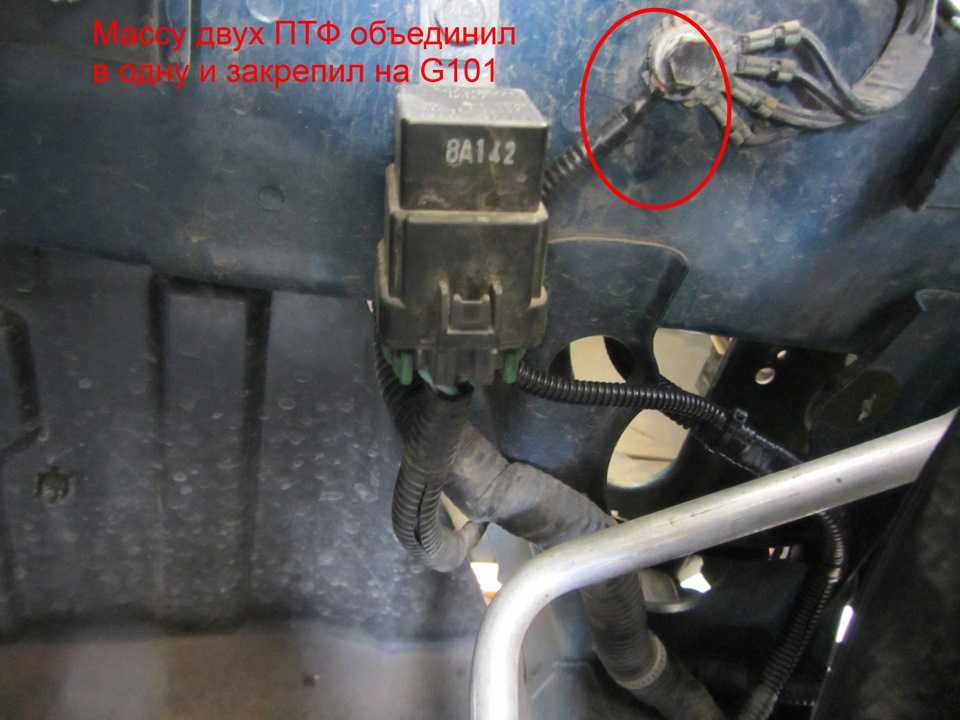 Все провода были аккуратно уложены в гофру и смонтированы. Минусовые провода от двух фар были объединены и прикручены к соединению с массой G101 (находится возле правой ПТФ). Провода питания ПТФ (плюсовые) были проведены в гофре к блоку предохранителей: