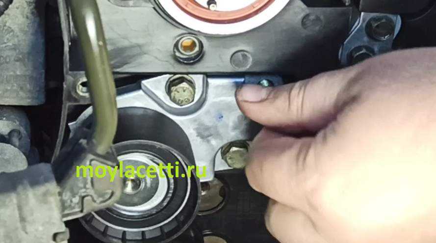 Установите винт натяжного ролика приводного ремня газораспределительного механизма. Пока не затягивайте болт.
