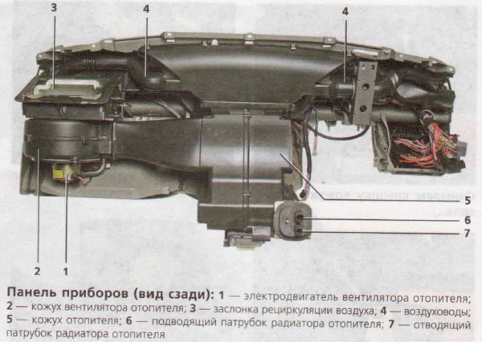 Сверху — на защелке, а в нижней части есть фигурная скобка недалеко от патрубков, ее держит саморез, который можно хорошо рассмотреть в зеркало. Кстати, в корпусе вы натолкнетесь на резистор, отвечающий за первые три скорости печки.