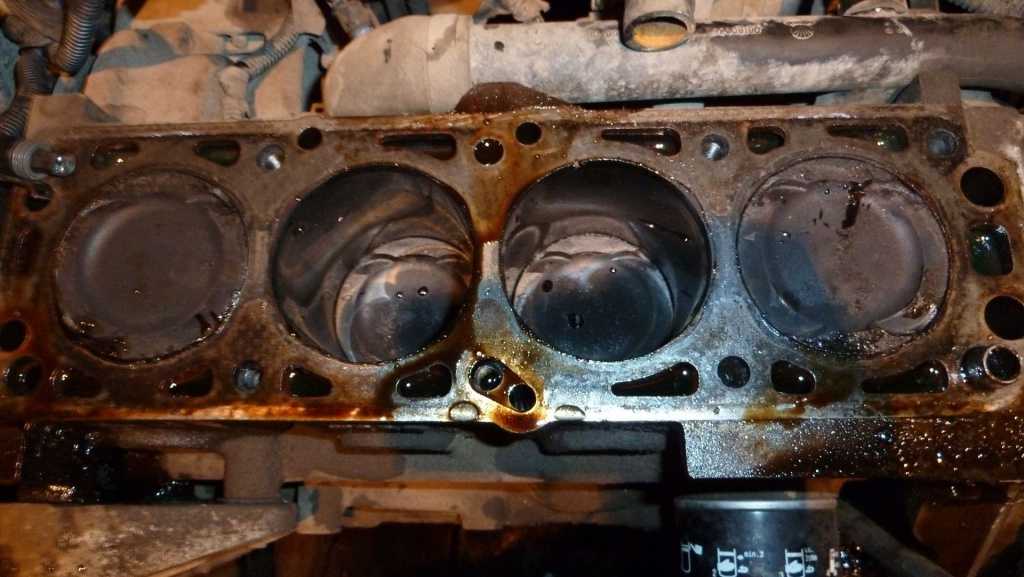 Прокладка может прогореть после перегрева двигателя, также головка блока может быть неправильно обтянута после предыдущих ремонтов. Если прокладка прогорела, то масло будет стекать по стенке блока цилиндров.