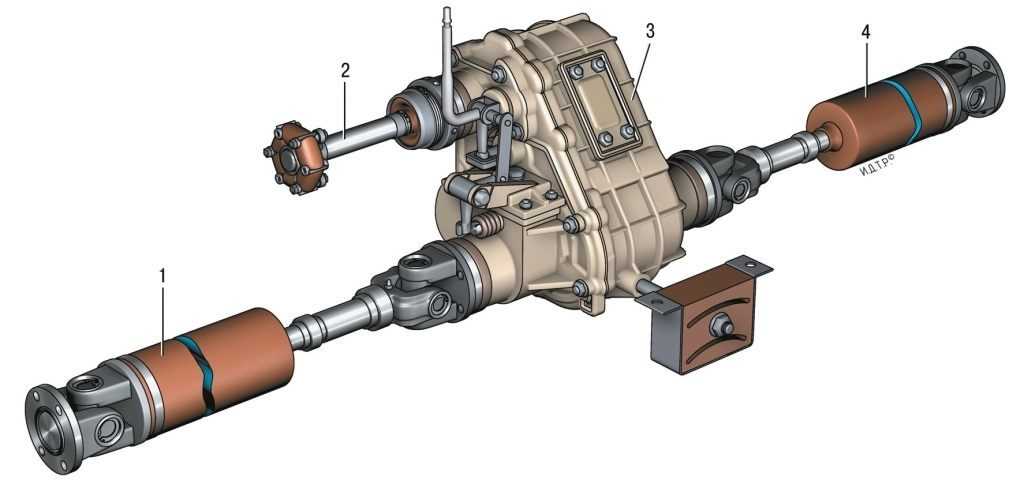 Механизм раздаточной коробки включает более 60-ти самостоятельных деталей, что подтверждает представленный чертеж. Поэтому вполне благоразумно назвать основные элементы и их предназначение.