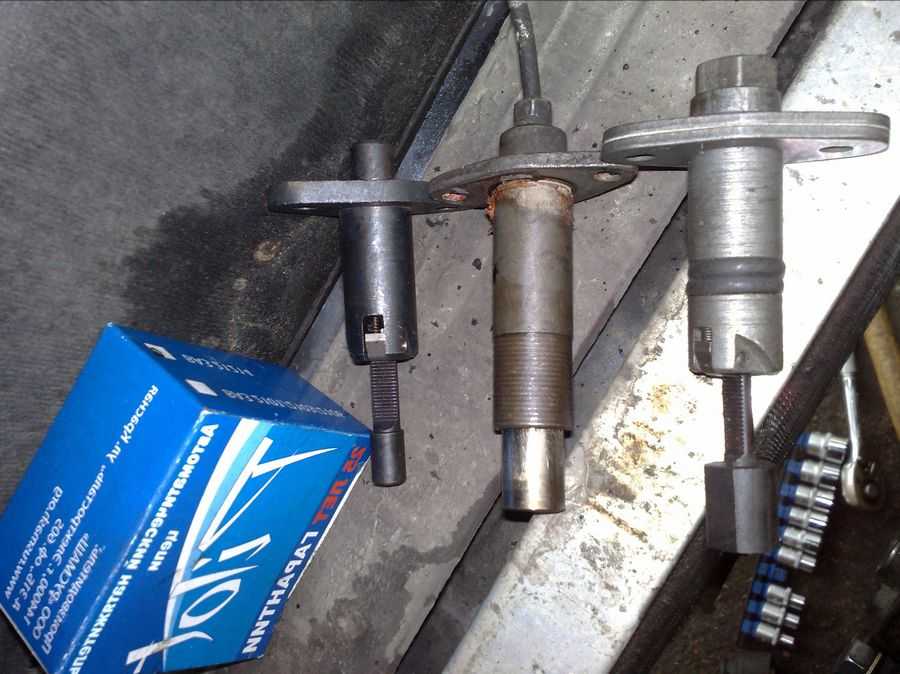При помощи свечного ключа снимается тройник и взамен устанавливается датчик давления. Ключом на 10 откручиваются две гайки натяжителя. Последний убирается с места. Достается верхняя гайка. Ее можно достать пассатижами или трубчатым ключом.